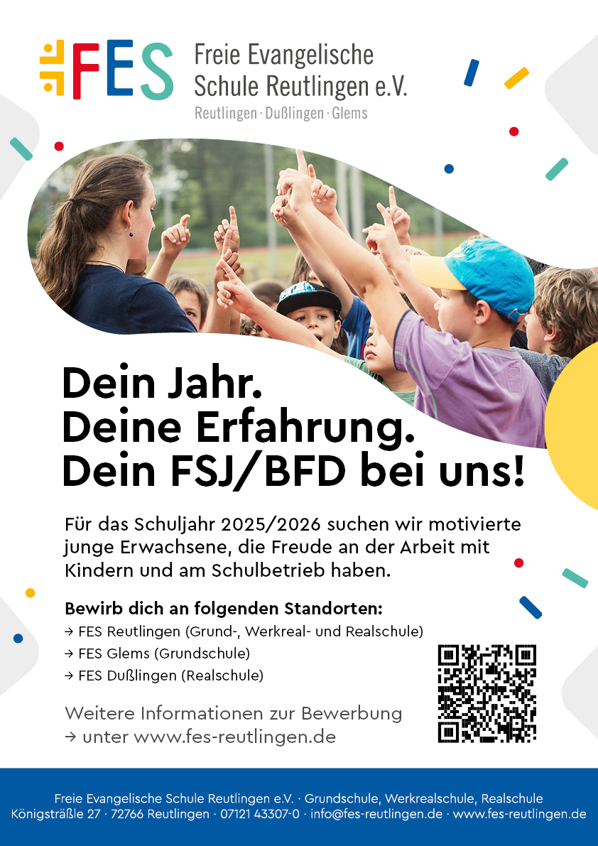 Weiterlesen...Die Freie Evangelische Realschule Dußlingen ist eine anerkannte Einsatzstelle und bietet im Schuljahr 2022/23 jungen Erwachsenen die Möglichkeit im Rahmen eines Freiwilligen Sozialen Jahres Erfahrungen im Bereich unserer Realschule zu sammeln und den gesamten Schulbetrieb kennen zu lernen.