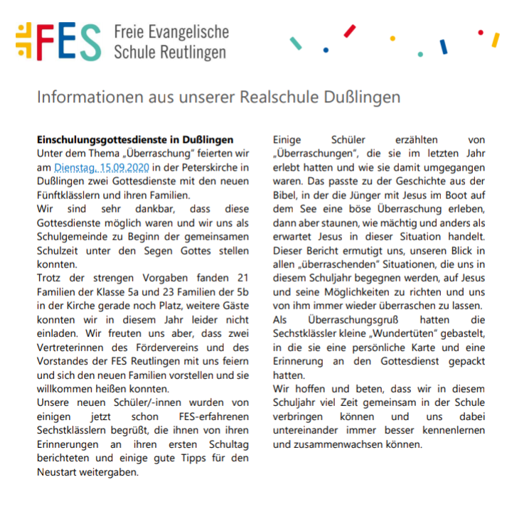 Wir freuen uns sehr darüber, dass am Dienstag, 15.09.2020, die neuen Fünftklässler/-innen mit einem Schulanfangsgottesdienst ihre Laufbahn als Schüler/-innen der FES Dußlingen antreten durften.