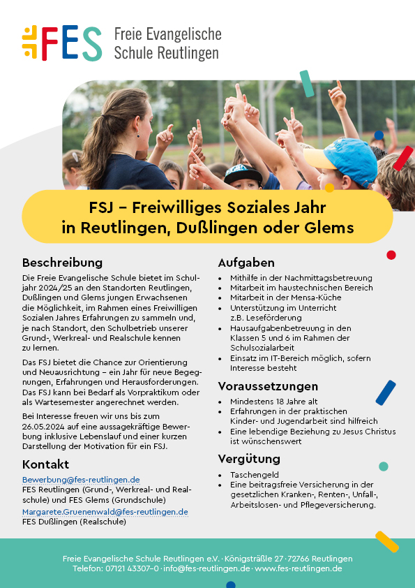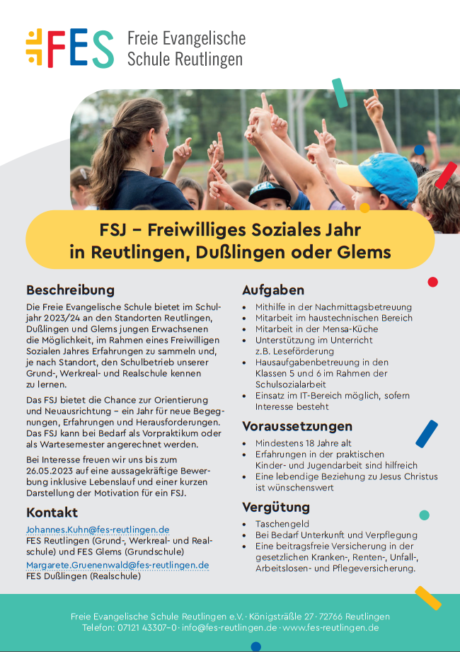 Weiterlesen...Die Freie Evangelische Realschule Dußlingen ist eine anerkannte Einsatzstelle und bietet im Schuljahr 2022/23 jungen Erwachsenen die Möglichkeit im Rahmen eines Freiwilligen Sozialen Jahres Erfahrungen im Bereich unserer Realschule zu sammeln und den gesamten Schulbetrieb kennen zu lernen.