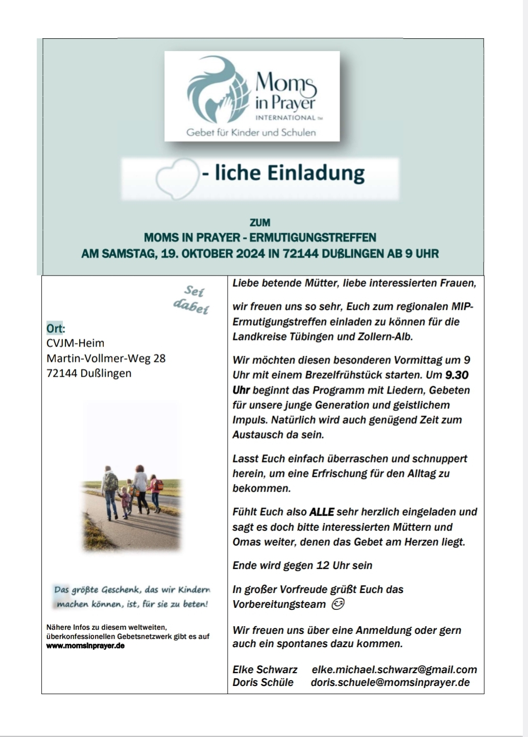 Herzliche Einladung an alle Mütter zum MOMS IN PRAYER Ermutigungstreffen am Samstag, 19.10. im Dußlinger CVJM-Heim!